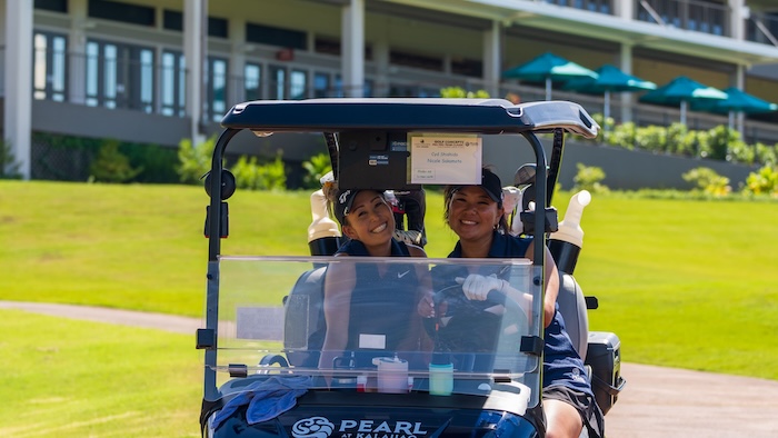 Cyd Shishido (left) and Nicole Sakamoto (right) of Pearl at Kalauao are all smiles during the 2025 Golf Concepts Pro-Pro Championship. (Photo, Aloha Section PGA)