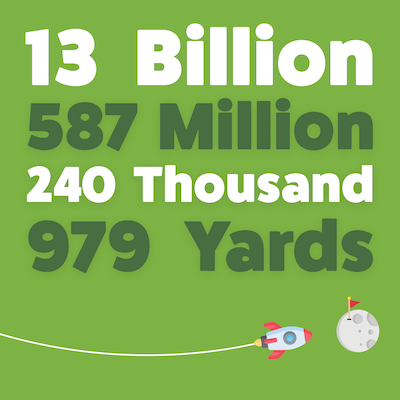 - That’s a total distance of 13,587,240,979 yards, which is equivalent to 32 times to the moon and back!