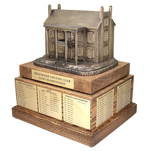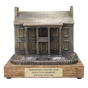 Establishing pride and tradition is an essential piece to building a strong club culture. With this in mind, Bentwood Country Club commissioned Malcolm DeMille to create a Club Championship trophy that reflected the historic land in which the club resides. Inspired by the Midway Mansion, the elegant 1847 antebellum home found on Brentwood CC’s property, features white columns that gleam through a vista of rolling meadows and shade trees, and lent itself to make an eye-catching trophy. Malcolm DeMille sculpted a replica of the Midway Mansion in antique bronze, and set it upon a walnut perpetual base. The members were thrilled to compete for such a stunning work of art and a trophy they were proud to take home commemorating the event.