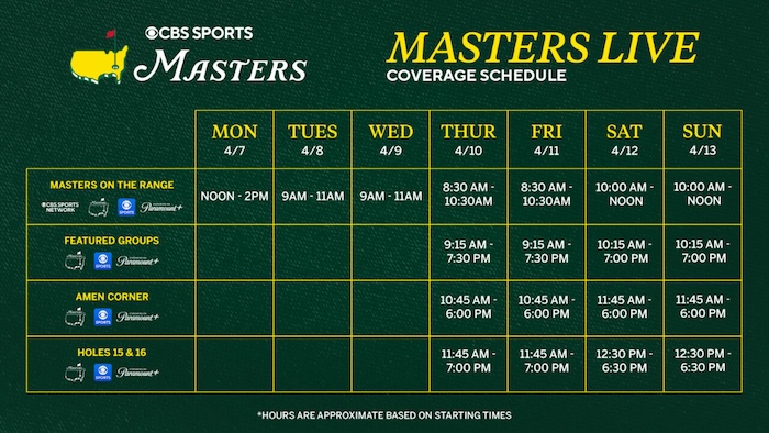 Masters Live, featuring full-day streaming coverage of the 2025 Masters Tournament will offer four channels of live action available on Paramount+, CBSSports.com, and the CBS Sports app for mobile devices. 2025 Masters Live coverage schedule: