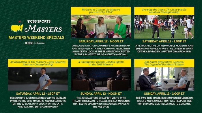 Leading into live weekend coverage of the Masters, CBS Sports will broadcast five Masters specials – airing on the CBS Television Network and streaming live on Paramount+ – highlighting the tradition and memorable moments surrounding Augusta National Golf Club.