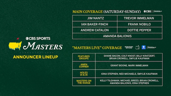In his 40th consecutive year covering the Masters, Jim Nantz will serve as host for the 37th time. 2008 Masters champion Trevor Immelman joins Nantz as the lead analyst at the Masters for the third consecutive year. CBS Sports’ full announcer lineup: