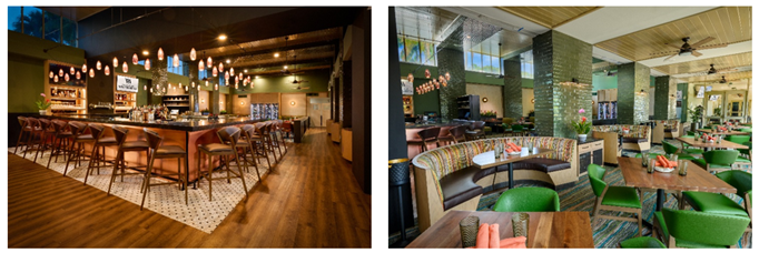 The bar and restaurant—now named Table Eighty-Nine—have received a stunning makeover with expanded seating and contemporary décor, including half-round booths that face the golf course and patio. The bar area has been revitalized with new tables and banquettes, all upholstered in vibrant colors. A mega, 80-inch television was added, perfect for movie and sporting events. The bar is stocked with a curated wine list, craft cocktails, and numerous beer options.