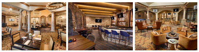 The reimagined 19th Hole bar and lounge, an exclusive adults-only retreat, offers cocktail and soft seating to encourage social gathering and conversation. The color palette remains warm and complements existing stone and hand-painted ceiling features with neutral tones accented with rich hues of blue and terracotta.