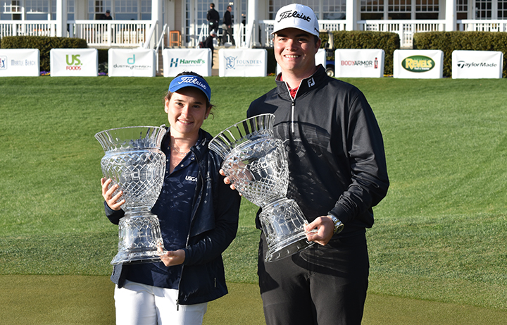 MYRTLE BEACH, S.C. – Tyler Wilkes (Tampa, Fla.) emerged from a crowded leaderboard while Taylor Roberts (Parkland, Fla.) rallied from a two-shot deficit at TPC Myrtle Beach to win the boys and girls titles at Fifth Annual Dustin Johnson World Junior Golf Championship presented by Fujikura.