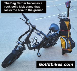 In addition to PAS and throttle, the ebikes are equipped with fat turf-friendly floatation tires, a low step-thru frame, front fork and seat suspension for a smooth ride, safe disk brakes, a powerful 2-round battery, and a unique Made-in-America “Auto Pivot Bag Carrier” that is also the kick stand. It holds any golf bag, and tilts out into a rock-solid kick stand that safely locks the bike to the ground on any slope. When you take off to your next shot, the bag carrier automatically rotates back into the upright carry-position. Balance is automatic. You don’t even feel it on the side of the bike.