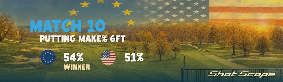 - Data: 54% vs 51% – Team EUR shows a marginal advantage at making short putts, which can be a massive confidence booster, and momentum builder/swinger.