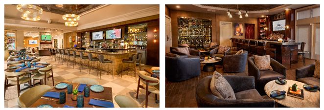 Beyond the fireplace is the all-new Grille Room & Bar, full of natural light, fresh colors, and an antique mirrored ceiling that enhances the bold, bright atmosphere. Dining tables are arranged around a new 18-seat bar that serves as the hub and heartbeat of the primary dining space. Two easily accessible and intimate dining spaces, plus the adjacent patio, are perfect for private parties, meetings, or other special events.