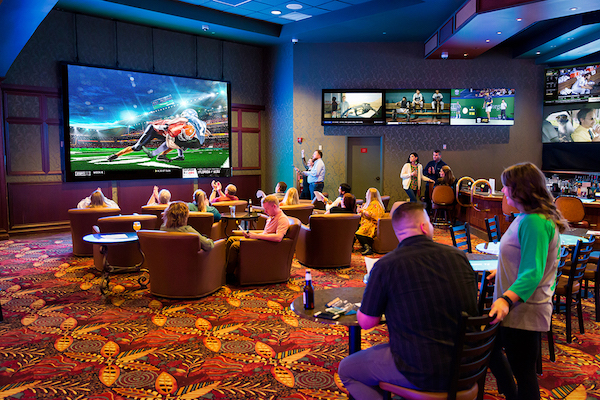 The adjacent, brilliantly-designed sports-viewing lounge features a pair of state-of-the-art 14-feet-long by eight-feet-high LED video walls that anchor the lively sportsbook viewing area. Along with 18 additional TV monitors, the sportsbook also includes eight self-serve betting kiosks, and up to three staffed over-the-counter betting windows to accommodate guests.