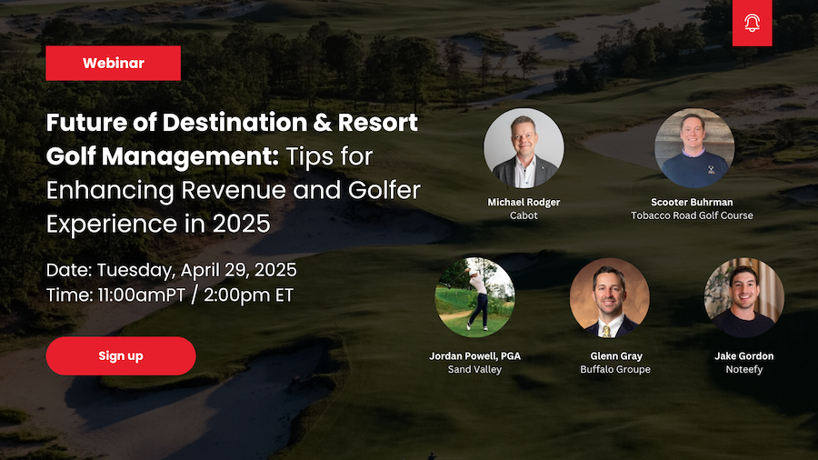 Hosted by Noteefy, the leading demand and revenue management platform for golf operators, The Future of Destination & Resort Golf Management webinar will be held on April 29, 2025 at 11:00 AM PST / 2:00 PM EST. This session brings together leading operators from across the golf and hospitality industry to share how they’re planning for another year of growth.