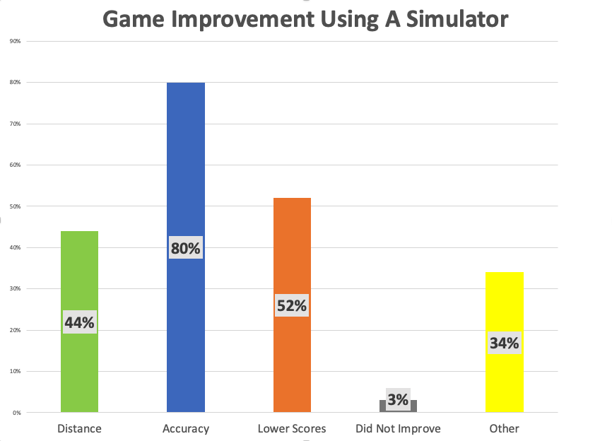 Accuracy improvements topped the list — which makes sense when you’re seeing shot-by-shot feedback on your club path and face angle. Distance gains often come from better contact and more efficient swings, and of course, all of that adds up to lower scores. One mid-handicap user from Chicago, Illinois commented, “I use my simulator three times per week and have seen dramatic improvements. I was able to improve my driving distance by as much as 40 yards, gained 10 yards with my 7-iron and have lowered by score by about four strokes per round. I am now using it to work on my short wedges. Buying a simulator was a great investment in my game.”