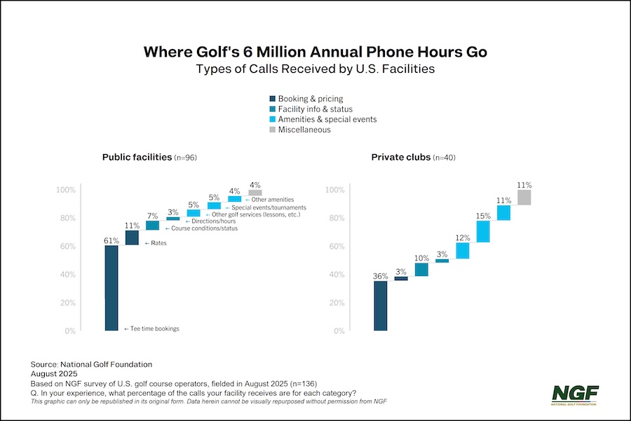 Based on our research and modeling efforts, we’d estimate that U.S. golf courses have collectively burned through more than 6 million phone hours over the past 12 months, equating to over $100 million in staff time when applying conservative wage data for shop employees and assistant professionals, who field most calls.