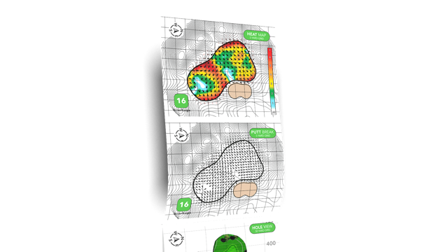 The topographical guides include three views of every hole. Quick-view heat maps outline the green’s undulations and provide large, easy-to-see arrows which help golfers identify the areas to avoid when planning approach, pitch, and chip shots. Using these amazing course management features helps bring confidance to pressure putting where strokes are lost. A second, close-up perspective of the green highlights the subtle changes in elevation and direction that are often undetectable to the naked eye. Combined, the maps help make every putt read quick and simple, and virtually eliminate the 3-putt.