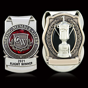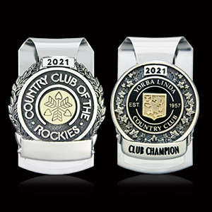Both the Country Club of the Rockies and Yorba Linda Country Club were looking for a gift to give their Men’s and Senior Men’s Club Champion. CC of the Rockies decided upon a 2-piece sculpted antique polished nickel and brass money clip detailed with a wreath and the club’s logo in polished brass. Yorba Linda CC also opted for a sculptural polished antique nickel and brass money clip featuring ivy details and black epoxy.