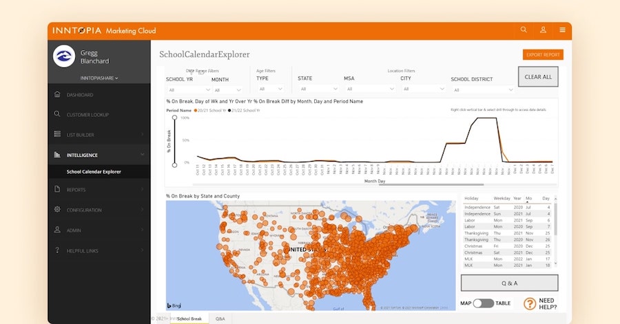 “School calendar data is full of opportunities for travel companies, but the dataset has always been handcuffed by being stuck in a spreadsheet,” said Trevor Crist, CEO of Inntopia. “This new dataset and interactive dashboard give operators the chance to explore this data in ways that was simply not possible until now.”