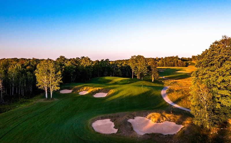 A central drumlin ridge runs through the property, creating bold elevation changes and a strategic mix of short risk-reward par 4s, reachable par 5s, and demanding par 3s. Rugged bunkering, dramatic green complexes, and natural contours challenge players to carefully plan every shot.
