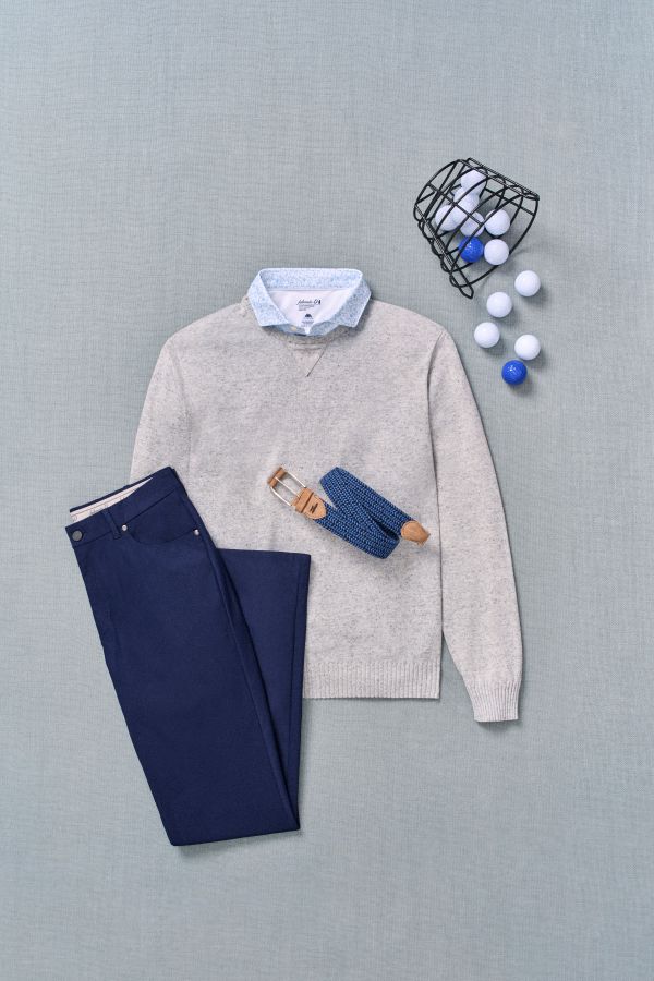 - Sunday: Albus Crewneck Sweater in Light Gray layered over the Performance Jersey Polo in Beach Break, paired with the Cross Country Pant in Navy and the Cotton Stretch Belt in Twilight.