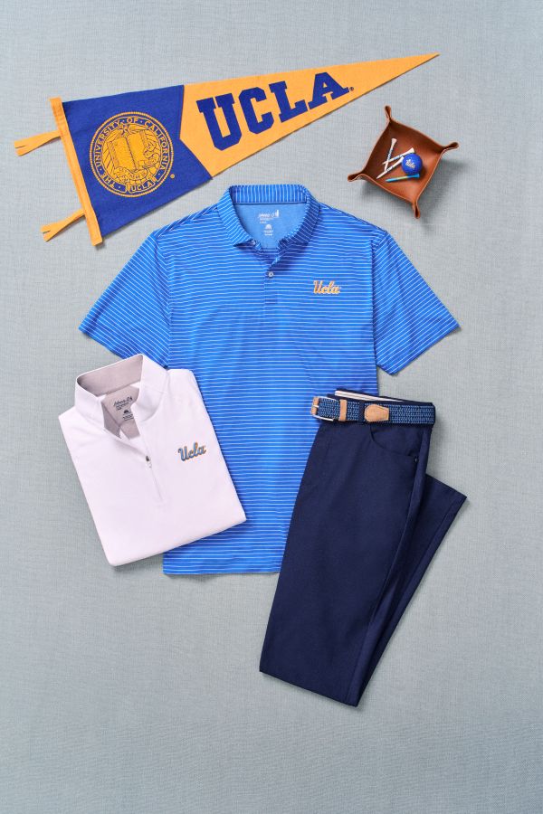 - Thursday: UCLA Freeborne Quarter-Zip in White layered over the UCLA Performance Jersey Polo in Blue Palisades, paired with the Cross Country Flex Pant in Navy and the Cotton Stretch Belt in Twilight.