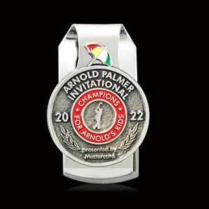 This year’s API money clips were sculpted in nickel plate and featured an umbrella pattern and rain textured background. The API Champions for Arnold’s Kids players received badges that were crafted in a light antique nickel, featured the CFAK seal logo, and adorned with a tiny umbrella. Both money clips are finished with color epoxy to tie in with Arnold Palmer’s iconic color scheme. Not only did these money clips serve as identification during the tournament, but are now a lasting memento for all the 2022 participants.
