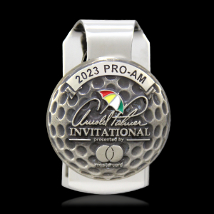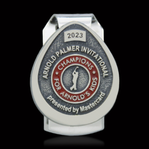 The Champions for Arnold’s Kids participants badges that took the shape of a raindrop. They were crafted in a light antique nickel, featured the CFAK seal logo, and were finished with red epoxy. Both Pro-Am and API Players money clips serve as identification during the tournament and stay as a lasting memento for all the 2023 participants.