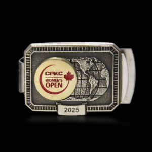 North of the border, the CPKC Women’s Open celebrates women’s golf and the rails that unified the continent. The money clip features a brass ball marker which is magnetically attached, as well as, vibrant red epoxy to highlight the logo. The main body of the money clip has a finely embossed map showcasing CPKC’s contribution to railroading in North America as a great sponsor activation.