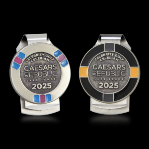 Capturing the vibrant energy of the casino floor, the Caesars Republic Lake Tahoe money clips are a striking fusion of playfulness and luxury. Inspired by casino chips, each money clip features a circular medallion with the event’s name at the center. The designs come to life through vivid color accents: one version boasts a crisp border with blue and pink accents, while the other features a sleek black background with bold orange and gray.