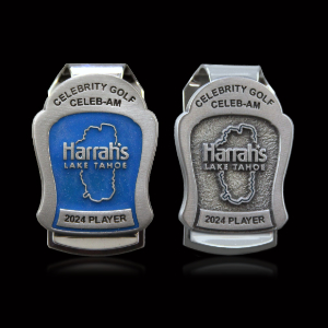 Since 2020 Harrah’s Lake Tahoe Celebrity Golf Celeb-Am has turned to Malcolm DeMille to create money clips that double as player badges. This year our team created two satin nickel money clips one featuring a blue epoxy filling the background, and the second design featuring a thin blue epoxy outline of Lake Tahoe in the tournament’s logo. The difference in designs using the same mold offered the tournament a clear distinction between two different badge types.