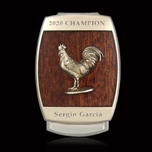 In the final round of the Sanderson Farms Championship, Sergio Garcia shared the lead, lost the lead and then made his way back with a final birdie at the 18th hole for an exciting finish and the win! Garcia’s never give up attitude earned him the spirited rooster “Reveille” sculpted and handcrafted by Malcolm DeMille. This iconic trophy is cast in bronze with fired colorful patinas to create its realistic appearance. The team at Malcolm DeMille also created hand cast Money Clips for VIP’s and the new Champion. These sculpted bronze money clips showcase the Sanderson Farms champion rooster atop an Exotic Sapele wood inlay with room to engrave the recipient’s name. The trophy and money clips are exceptional pieces of art that will undoubtedly be a “feather in the cap” for all recipients!