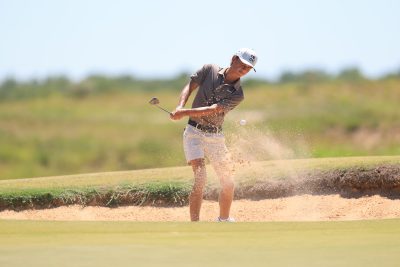 Miles Russell plays a shot out of the bunker on the seventh hole during the round of 16 of the 2025 U.S. Junior Amateur at Trinity Forest Golf Club in Dallas, Texas on Thursday, July 24, 2025. (Dustin Satloff/USGA)