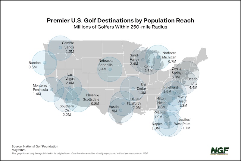While many of the more prominent golf travel hotspots are highlighted in the below graphic, more than 1,250 golf facilities in the U.S. overall have a resort component. And thousands more are sojourn-worthy destinations that are helping fuel what is the second-largest contributor to the U.S. golf economy: travel & tourism.