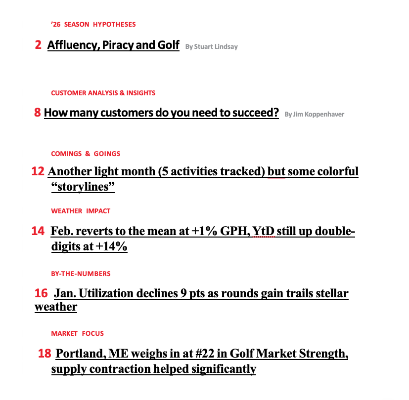 Contributing Editor Stuart Lindsay leads this month with a review of the upbeat ’26 outlook for golf by parties external to the industry and the macro-economic factors driving that optimism. Despite the industry’s historical aspirations to expand the “democratization of public golf” (i.e. the golf population should reflect the general population in gender, income, age and race), it appears that the K-shaped recovery is becoming more an E-shaped recovery (affluent, mid-income, lower-income) with the top 2 tiers being flush and comfortable respectively which also aligns well with golf’s historical profile. Stuart weaves that together in his article titled Affluence, Piracy and Golf featuring Jimmy Buffett.