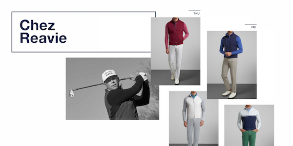- Chez Reavie – Reavie will wear our most popular pant, the eb66 Performance Five-Pocket pant on Thursday and Sunday. Highly acclaimed, our best-selling performance pants have the sophisticated appearance of a weekend-ready five-pocket pant, featuring lightweight stretch and a natural feel. They’re designed with an easy-care, quick-drying fabric that wicks away moisture and provides a sharp presentation on or off the course. This season, our design team utilized an updated yarn and applied a matte finish for an even cleaner aesthetic. In addition to the essential colors in your closet, Field Green is one of the new seasonal colors launching in this pant for fall.