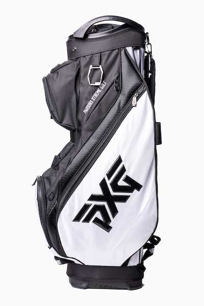 PXG’s stylish Lightweight Cart Bag delivers elevated detailing and unmatched craftsmanship. The black-and-white bags are equipped with a 14-way top to keep clubs ultra-organized and 17 total pockets for storing all on-course essentials. Features include a dual valuables pocket with combination locks, a water bottle holder, a pen slot, umbrella storage, a customizable ball pocket, and a patented external magnetic putter attachment.