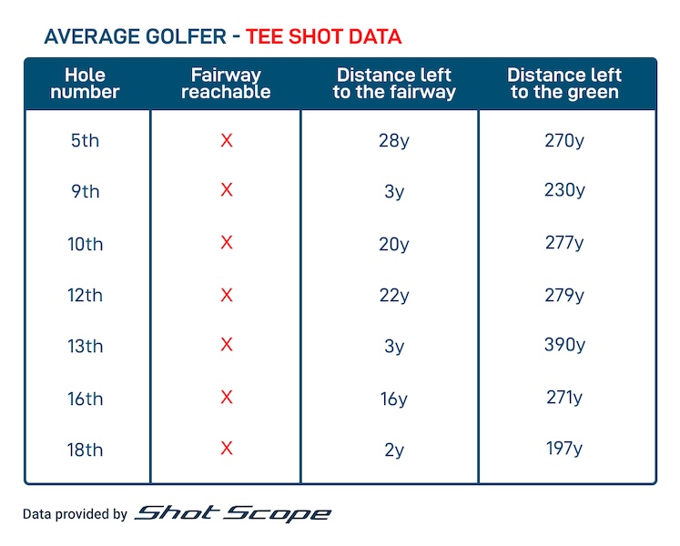 With the course having four par 3s, this means there are 14 opportunities to hit the fairway. Unfortunately, the average amateur golfer does not have the firepower to reach the short stuff on seven of the holes from the professional tees, as shown in the table below:
