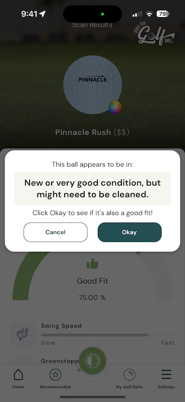 In addition, the ScanMyGolfBall app also questions a golfer about swing speed, flight path tendencies, general trajectory, short-game spin, and more. Based on those answers, the app builds a profile and ultimately recommends specific golf ball models. Plus, golfers can instantly scan any ball to see how well that model fits their game and its condition.
