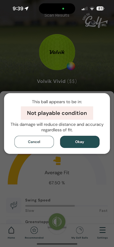 When golfers now scan their golf ball looking for damage assessment, they will get an image on the app that showcases the following messages: