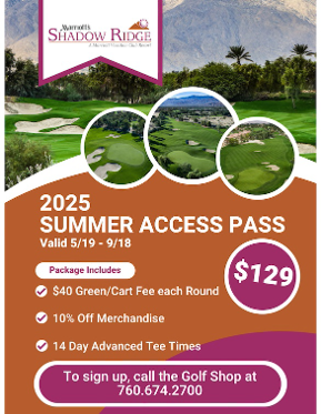 Passes are available for usage beginning Monday, May 19th. To sign up, or for more information, call the Golf Shop at (760) 674-2700.