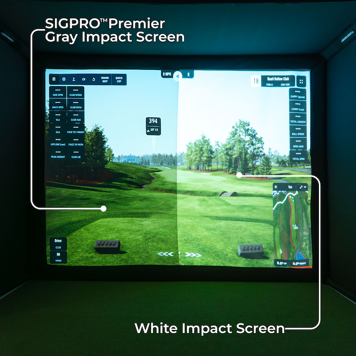 The SIGPRO Premier Golf Simulator Impact Screen offers improved contrast, as gray screens absorb more ambient light than white or silver screens, which helps to maintain deeper blacks and prevents on-screen images from appearing washed out in brighter environments. The new screen also minimizes the effects of light bouncing off the screen, resulting in a consistently clearer and more crisp image. Golf simulators often operate in rooms that aren’t completely dark, so the ability of a gray screen to maintain contrast in these conditions creates a new level of sharpness, clarity and richness of colors.