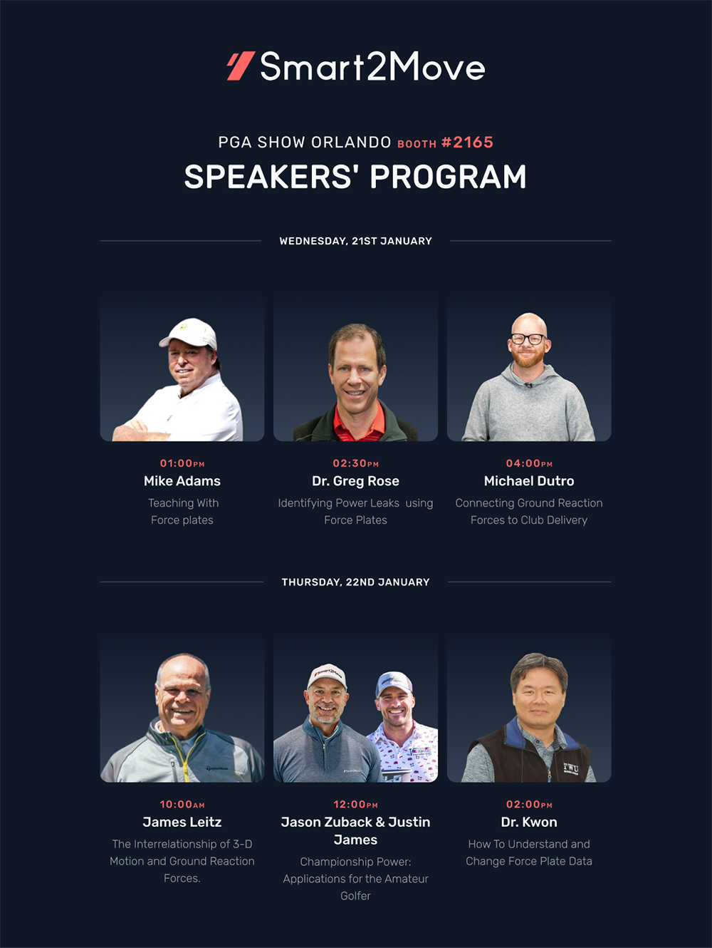 Located at Booth #2165, Smart2Move will deliver an unmissable education experience, bringing together some of the most influential minds in golf instruction, biomechanics, and performance science. The sessions are designed to bridge data, coaching application, and real-world performance, providing actionable insights for coaches, instructors, and performance professionals.