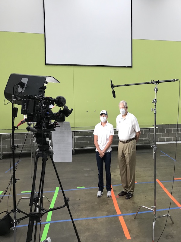 - LPGA Tour player Stacy Lewis and Spirit Golf Association founder Corby Robertson Jr. film a promotional video for the Houston Food Bank supporting the Spirit Food Fund. Photo courtesy of Spirit Golf Association