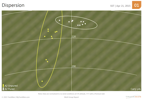 For the golfer, these results mean that using a PUREd driver shaft will lead to hitting shots farther off the tee, both in carry distance and total distance, thereby allowing for shorter clubs to be hit on approach shots. Tee shots will also be more accurate – 13.2 yards offline can be the difference in playing from the fairway versus the rough or a hazard. Furthermore, with the ball in the fairway, a 13.2 yard difference in accuracy can mean landing in a part of the fairway that allows for a more favorable angle of approach to the green. In short, using a driver shaft that has been SST PUREd will allow the golfer to hit tee shots farther and straighter.