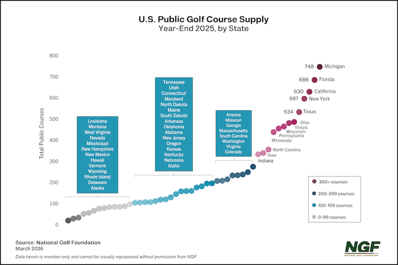 The U.S. leader in publicly accessible golf is Michigan, whose 748 daily fee, municipal and resort courses are more than the total golf supply in 45 other states. With 868 golf courses overall at the start of 2026, Michigan is one of five states with 800+ courses – behind Florida (1,290) and California (963), and just ahead of New York (830) and Texas (825). And 86% of the golf courses in Michigan are public, notably higher than the 72% national average.