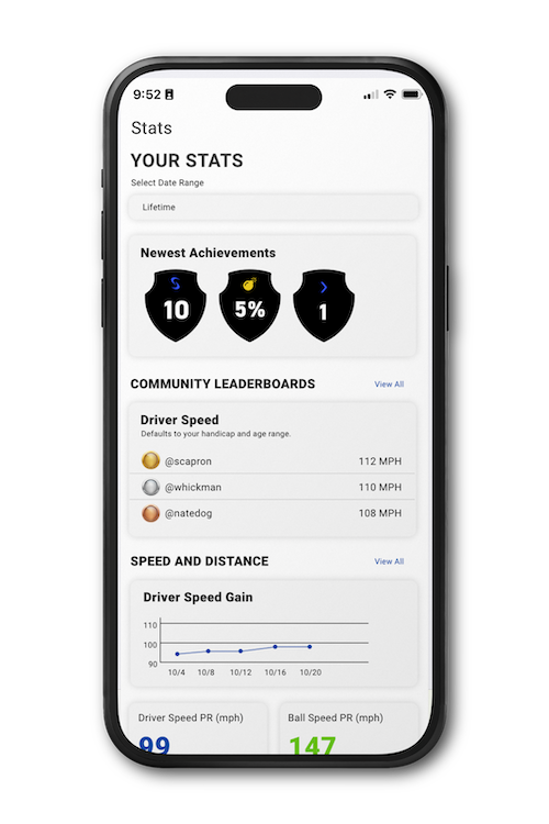 Interactive components include achievements with badges that come when users complete programs, make certain percentage speed gains, and compare their dominant and non-dominant swings. Leaderboards allow players to see how they stack up against each other, as users can sort their data against other users by age, handicap, gender and other aspects.