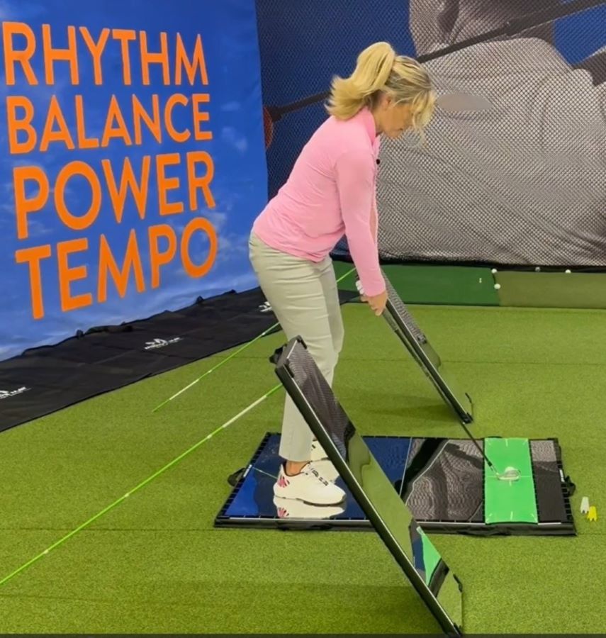 The Mirror Mat is an innovative golf training tool designed to transform the way golfers practice and improve their game. Combining two essential training elements—shatterproof reflective surfaces and a built-in, color-changing hitting strip—the Mirror Mat provides life-size visual feedback and immediate insights into body and club movements. This Patent-Pending product empowers players to see their swing mechanics from a Golfer’s Point of View, allowing for real-time adjustments without losing position.