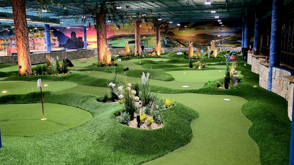 The Flagship putting course is legitimately the new Putting Capitol of the World. The entire design is crafted to mirror the contours, nuances, and challenges of its outdoor twin. This is serious putting, wrapped in a wonderful Scottish-themed interior design, complete with Village facades and imagery of the Old Course of St Andrews and Carnoustie by former golf photographer-of-the-year, John R. Johnson of GolfPhotos.com. In addition, the course walls are adorned with one of the World’s largest collections of antique hickory golf clubs, on display in a museum-like setting, with some dating back to the 1700s.