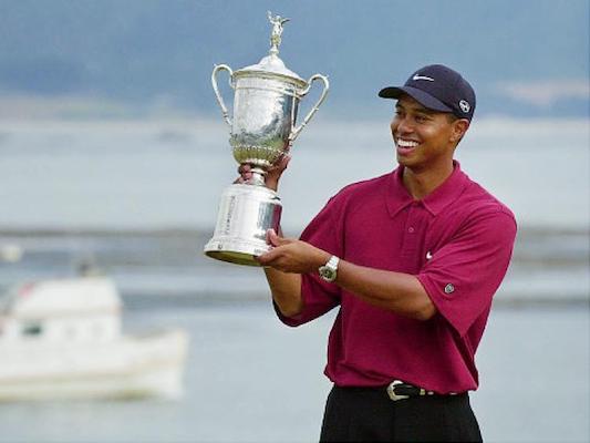 - 18 – Tiger Woods “Slam” in 2000-2001: When Tiger Woods won the 2001 Masters Tournament he became the first golfer ever to hold all four men’s major championships simultaneously. The streak started with an amazing 15-shot victory in the 2000 U.S. Open at Pebble Beach. He followed that with an eight-shot victory in The Open Championship on the Old Course at St. Andrews, during which he became the youngest player ever to complete the career grand slam. The PGA Championship was tougher, requiring a three-hole playoff victory over journeyman Bob May in another record scoring effort. He capped it off with a two-shot victory over David Duval in the 2001 Masters.