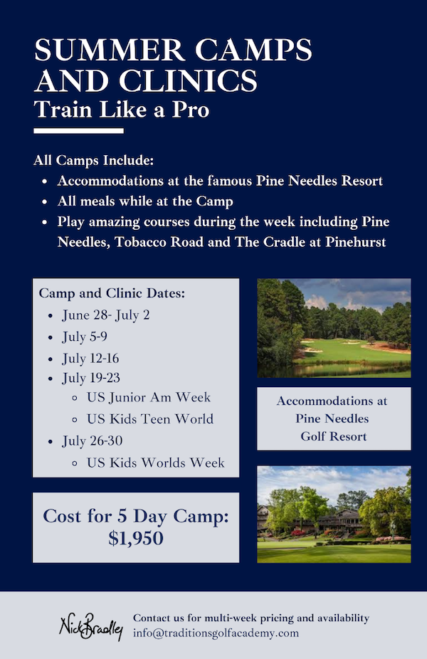 Pinehurst, NC – Traditions Golf Academy introduces summer camps and clinics. The Train Like a Pro week leans heavily on Director Nick Bradley’s 25 years coaching on the PGA Tour and European Tour. Young golfers will accelerate their knowledge, technique, and tournament preparation strategy in one of the most informative training schools in Junior Golf. Players such as Justin Rose, Sir Nick Faldo, Brad Faxon, and European #1 Junior Frank Kennedy have all consulted with Nick Bradley to improve their performances- now it’s your turn.