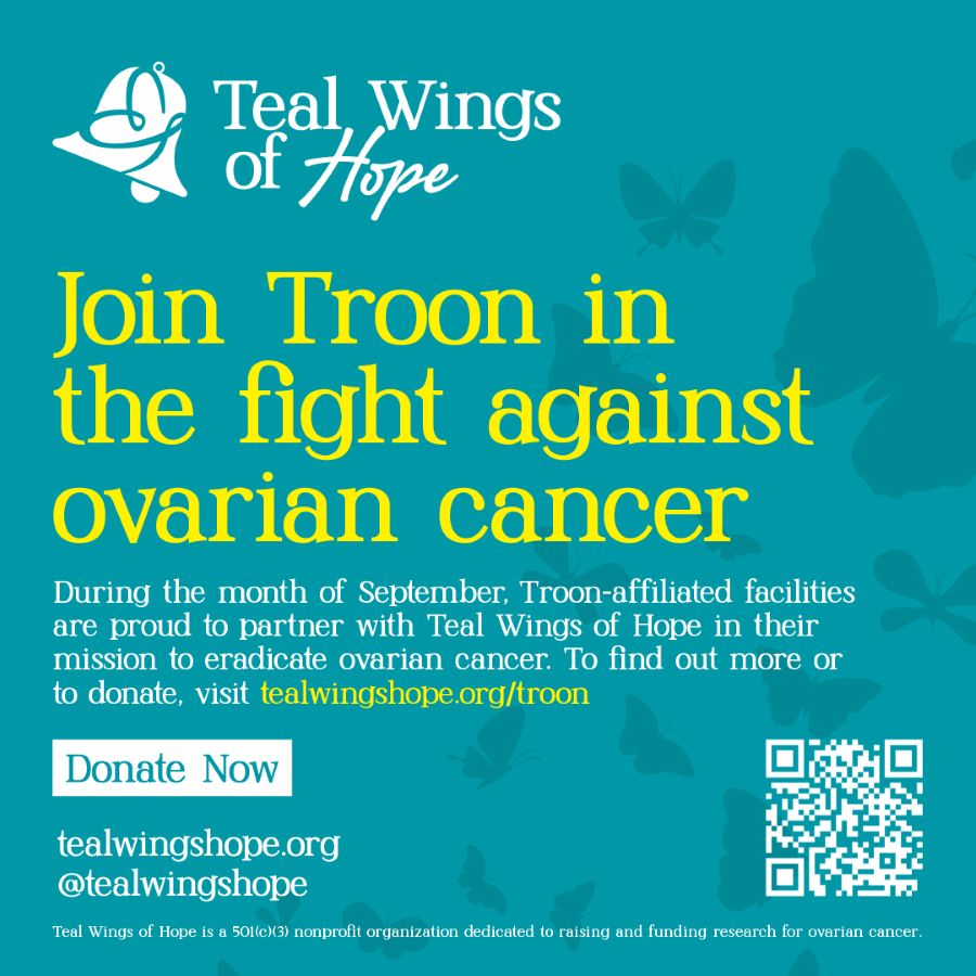 Scottsdale, Ariz. – Troon® and Troon-affiliated facilities across the U.S. will be raising funds for ovarian cancer research and awareness throughout the month of September, which is Ovarian Cancer Awareness Month. Troon-affiliated golf properties will fly teal checkered flags on their 18th greens to help raise awareness about ovarian cancer and will have various fundraising activities to support Teal Wings of Hope, a 501(c)(3) nonprofit organization dedicated to raising awareness and funding research for ovarian cancer.