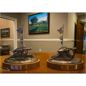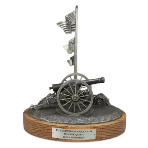 Who doesn’t want to take home a cannon? Secession Golf Club in Beaufort, South Carolina has a legendary cannon at the front of the clubhouse that has become an icon for southern golfers. To celebrate this landmark, they turned to Malcolm DeMille to make their cannon into a highly coveted trophy. The cast white bronze trophy sits at 10” x 7” x 10.5” tall with the cannon surrounded by bushes and flag pole flying United States, South Carolina, and Secession Club flags. The trophy’s cannon can also be moved to sit right or left facing—a unique detail that makes this trophy stand out.