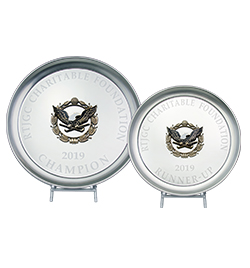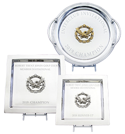 Robert Trent Jones GC was looking for a way to create award diversity for their various tournament events, while keeping the theme and integrity of their iconic eagle logo. The solution resided with the team at Malcolm DeMille. By changing Trophy Tray shapes and using different metals and materials for the logo, Malcolm DeMille was able to keep a common motif while still creating strikingly different awards.
